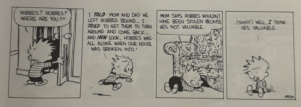 In our world, few, if any, have had the Charlie Brown experience, but nearly everyone has been in the shoes of both Calvin and of his parents, where we have both have been the one who hurt and the one who has been hurt, intentionally or not. This is a universal human experience and Watterson captures those moments brilliantly, successfully articulating them to the readers through someone who is actually growing up, just like we, the readers, were and continue to do. This could be another reason why Calvin and Hobbes remain in the zeitgeist today, the connection between reader and character formed a strong bond, and they grew up together.