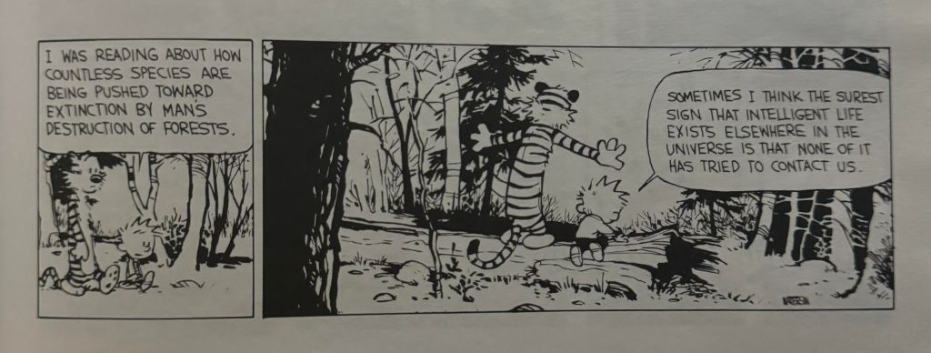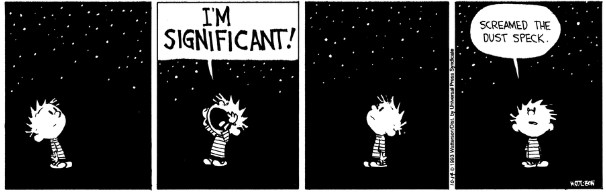 “The comic strip provides a look into the human condition and the desire for meaning contrasted against a vast, unanswering universe. This closely resembles Camus’s description of the absurdity of the universe. Calvin is seen calling out to the universe, a notion that could stand for humankinds’ search for meaning. The universe, however, does not answer. This causes a crisis for Calvin, as Camus stated it would for many people, as he now compares himself to the meaningless speck of dust.”