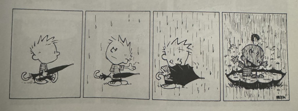 Calvin and Hobbes is layered with a façade of childlike naivety, but that childlike innocence is what makes the reader connect to the characters and the nuances of the comic in a more profound way. The childlike nature of thinking about how to use the umbrella in the exact opposite way is a perfect example, and that childlike nature is rediscovered, reengaged, and relearned as an adult reader. It’s a reteaching of how to be childlike, in imagination, in thought, and in questions. The nature of exploring just for the sake of going. This way of life is an art and science in it of itself. Calvin in his learnings is reteaching them to the audience, in a new and whimsical light. In Watterson’s panels, it’s more than an exploration of philosophy, it’s a deep look into the nature of learning and teaching through the mind and play of a child. The immortality of Calvin and Hobbes directly stems from that eclectic and miraculous mind of childhood – from the gifts of play.