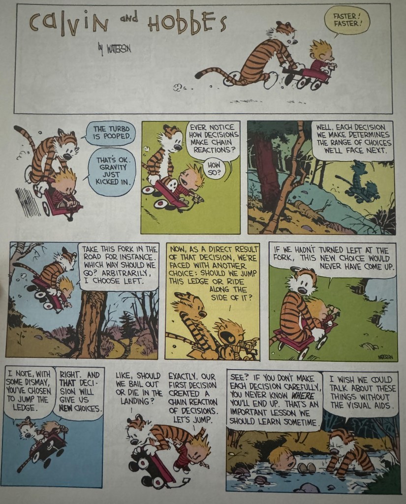 Watterson undermines and scrutinizes this seriousness. From a pedagogical perspective, if a person’s life is already predetermined according to John Calvin, then they cannot be held responsible to change their actions and morals. According to Hobbes, if the only thing keeping the peace between people is that social contract of self-interest and preservation, that means that people’s actions and ethics are based on a morality of behavior, whereas Calvin says it’s a morality of theology.